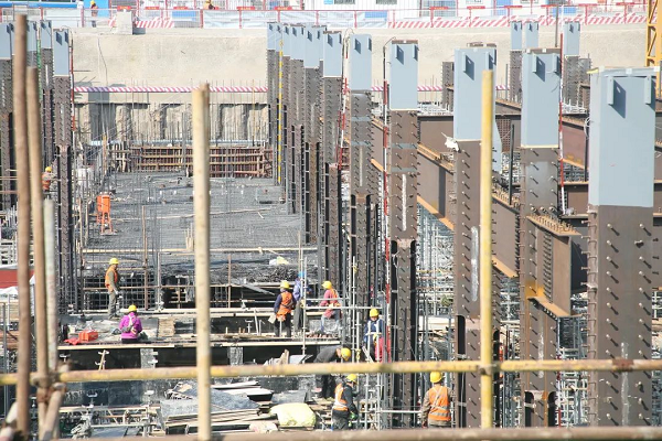 走进工地,一个巨大的基坑映入眼帘,随处都是忙碌施工的工人和大型器械。伴着微微轰鸣声,3台塔吊正在接续不断地向基坑内吊运建筑材料,工人们正在进行地下一层、地下二层的钢筋绑扎作业,工程进展紧张有序、忙而不乱。