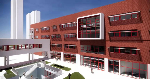 据了解,学校主教学楼设置于项目场地的中部,室外田径场位于场地的东侧,设有300米跑道及足球场地。目前正在建设的是西侧4栋主教学楼,待教学楼完工后再进行东侧操场的施工。